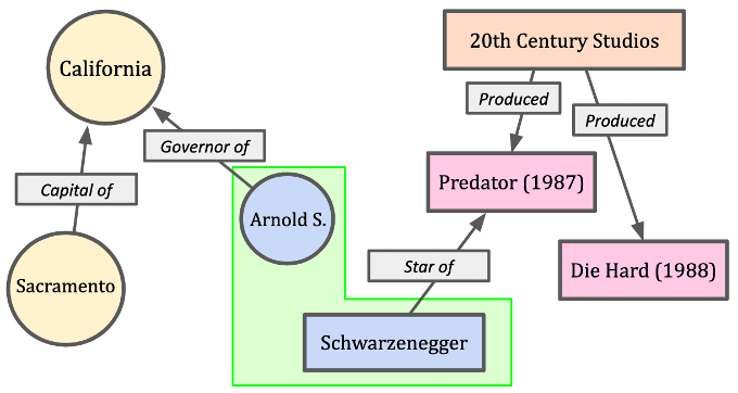 Figure 2 doesn’t generalize well because it relies on a human’s understanding of the words selected. Is “Governor Schwarzenegger” a valid name for Arnie? If so, it is left out! There are a number of possible ways to identify Arnie in English alone, which is why his referent should be uniquely identified by, say, r:arnie. This would link in English to the range of possible identifiers, directly or abstractly by phrase pattern (e.g. “Governor Schwarzenegger,” “Arnold Schwarzenegger,” “Arnold S. Schwarzenegger,” “Mr. Schwarzenegger,” “Mr Arnold Schwarzenegger,” “Governor Arnold Schwarzenegger,” “Ex-Governor Arnold Schwarzenegger,” and so on). r:arnie then represents all the language-specific terms that would identify it (including “the star of the movie ‘Predator’ from 1987”).